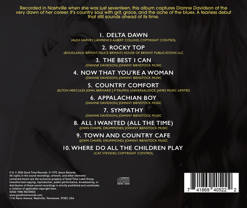 Recorded in Nashville when she was just seventeen, this album captures Dianne Davidson at the very dawn of her career. It's country soul with grit, grace, and the ache of the blues. A fearless debut that still sounds ahead of it's time.