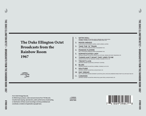 Here is a time capsule into the world of a musical titan who, after four decades at the helm of jazz innovation, was still striding through new artistic terrain with ease. Picture Duke Ellington-sharp as ever in a tailored suit, leading his octet through the glittering New York night atop Rockefeller Center. It's August of '67, and in the Rainbow Room, with it's cocktail-clinking ambiance, Duke and his select ensemble of veterans are reinventing the jazz vocabulary with every note.
