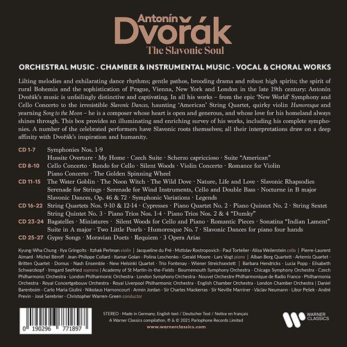 Limited 27 CD set. Lilting melodies and exhilarating dance rhythms; gentle pathos, brooding drama and robust high spirits; the spirit of rural Bohemia and the sophistication of Prague, Vienna, New York and London in the late 19th century: Antonin Dvořák's music is unfailingly distinctive and captivating. In all his works - from the epic 'New World' Symphony and Cello Concerto to the irresistible Slavonic Dances, haunting 'American' String Quartet, quirky violin Humoresque and yearning Song to the Moon - he is a composer whose heart is open and generous, and whose love for his homeland always shines through. This box provides an illuminating and enriching survey of his works, including his complete symphonies. A number of the celebrated performers have Slavonic roots themselves; all their interpretations draw on a deep affinity with Dvořák's inspiration and humanity.