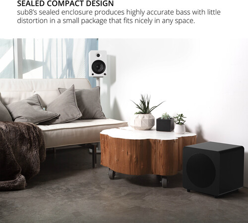 Sub8 gives you the speed and accuracy that only a sealed subwoofer can deliver. An 8” woofer driven by a 300 W amp responds quickly to transients and keeps distortion to a minimum. Its compact size provides full-range sound without sacrificing floor space and a crossover filter and phase control allow for easy integration into any audio system.