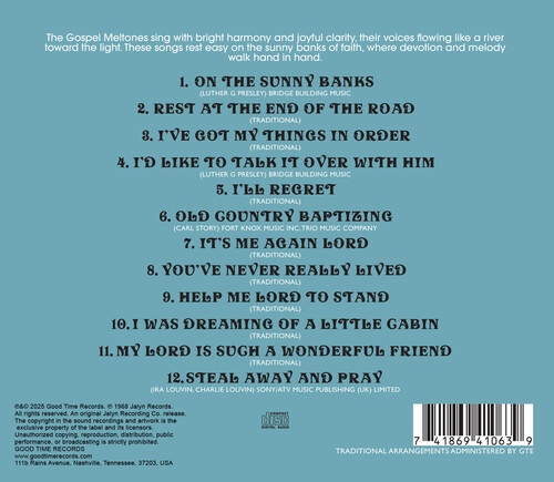 Jalyn Records is back! The Dayton, Ohio label from the creative mind of bluegrass legend Jack Lynch originally ran from the early '60s through the late '70s. Working out of his apartment on Brown Street, Lynch turned out a steady run of hard-driving bluegrass, country, and gospel sides cut by local pickers and big names alike, including Ralph Stanley and Don Reno. Decades on, these records are now lovingly remastered for modern ears and available on CD for the first time. Here, The Gospel Meltones sing with bright harmony and joyful clarity, their voices flowing like a river toward the light. These songs rest easy on the sunny banks of faith, where devotion and melody walk hand in hand.