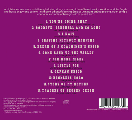 Jalyn Records is back! The Dayton, Ohio label from the creative mind of bluegrass legend Jack Lynch originally ran from the early '60s through the late '70s. Working out of his apartment on Brown Street, Lynch turned out a steady run of hard-driving bluegrass, country, and gospel sides cut by local pickers and big names alike, including Ralph Stanley and Don Reno. Decades on, these records are now lovingly remastered for modern ears and available on CD for the first time. On this album, Lee Allen pours his heart into this collection of traditional and original songs of love and tragedy. Rooted in tradition, this album honors the timeless spirit of bluegrass, country, and folk, carrying forward the sound of a genre built on storytelling, soul, and grit.