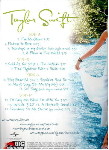 Double vinyl LP pressing in gatefold sleeve. 2006 self-titled debut studio album by superstar Taylor Swift. Swift was 16 years old at the time of the album's release and wrote it's songs during her freshman year of high school. Swift has writing credits on all of the album's songs, including those co-written with Liz Rose. Swift experimented with several producers, ultimately choosing Nathan Chapman, who had produced her demo album. Musically, the album is country music styled, and lyrically it speaks of romantic relationships, a couple of which Swift wrote from observing relationships before being in one.