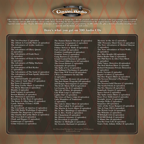 THE ULTIMATE CLASSIC RADIO COLLECTION is exactly what it sounds like! It's the greatest collection of classic radio ever assembled! This box set contains 400 half-hour classic radio shows (including the most popular) transferred from the original masters and digitally-remastered for superior sound quality. Nearly 200 hours of theater-of-the-mind original radio programming on 200 audio CDs. You'll also receive a 60-page historical booklet detailing all 400 radio episodes and the history of each series with hundreds of radio star photos!