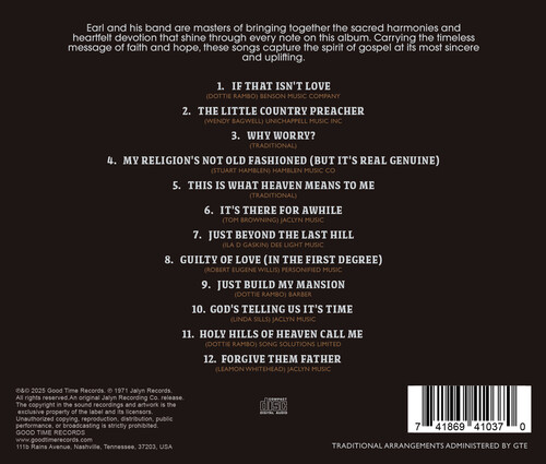 Earl and his band are masters of bringing together the sacred harmonies and heartfelt devotion that shine through every note on this album. Carrying the timeless message of faith and hope, these songs capture the spirit of gospel at it's most sincere and uplifting.